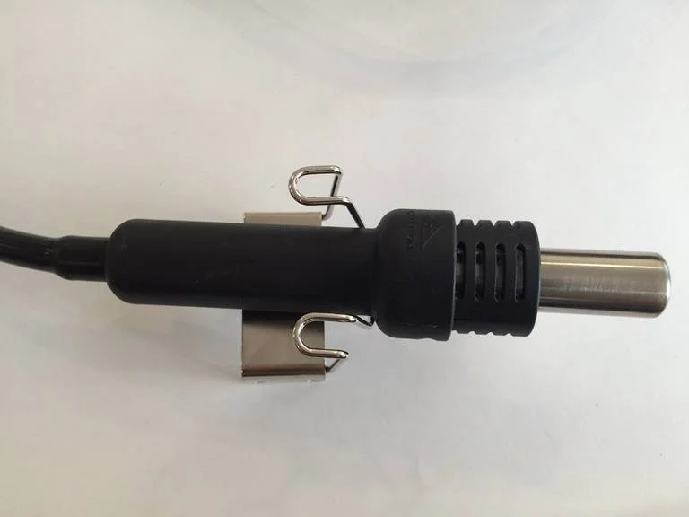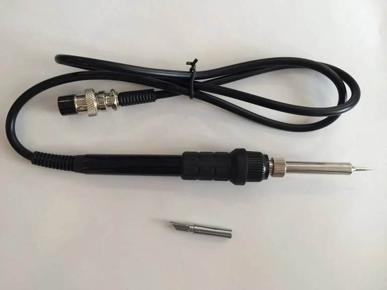 С каждым днем электронные компоненты становятся по размеру меньше и меньше. Подобная миниатюризация по отношению к многовыводным микросхемам, например, микросхемы в корпусах BGA, приводит и к соответствующим требованиям к рабочим органам паяльных станций. Мощность паяльника 50Вт позволяет работать с деталями, чувствительными к статическому электричеству, напряжение питания 26В, жало заземлено, что положительно влияет на безопасность выполнения работ. На ваш выбор, можете воспользоваться жалами двух типов. Оснащенный качественным керамическим нагревателем и встроенным сенсором температуры, паяльник бесступенчато регулируется посредством ручки на лицевой напели управления. Контроллер основного блока поддерживает постоянную температуру в пределах 200-480С с колебаниями не более ±15С. Присоединение паяльника осуществляется надежным пятиштырьковым разъемом.