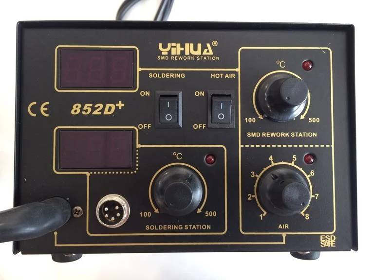 Основной отличительной чертой YIHUA-852D+ является индикация температуры паяльника и термофена на светодиодном дисплее в момент пайки, что удобно для контроля параметров и, если необходимо, для их фиксации при определенном виде работ. Возможно отдельное отключение функций переключателями «on-off». Верньерами осуществляется регулировка параметров, возможно ступенчатое регулирование температуры фена для SMD монтажа в пределах от 100-400С.