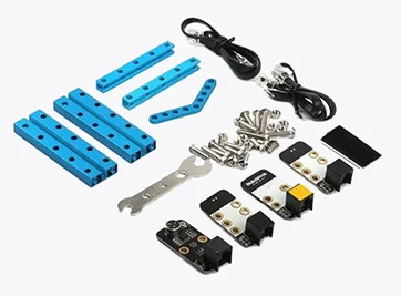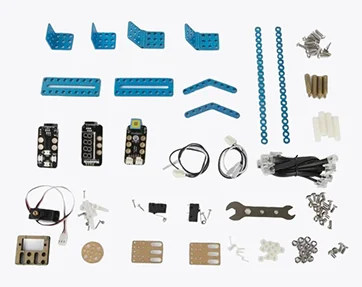 В набор входят контроллер на базе Arduino Mega2560, 2 датчика света, датчики температуры и звука, ультразвуковой дальномер, датчик линии, гироскоп, пьезоизлучатель, RGB светодиоды и детали для сборки.