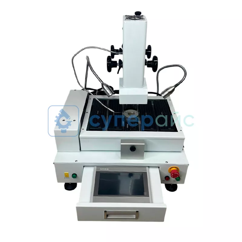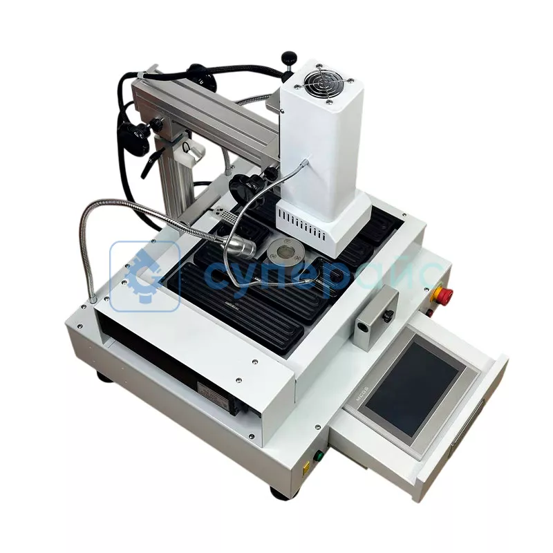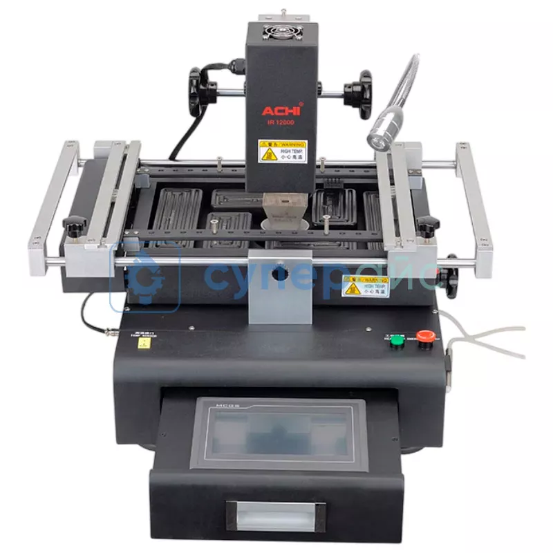ACHI IR12000 – это паяльный комплекс с подсветкой рабочей области, оборудованный выдвижным 7-дюймовым сенсорным дисплеем. Модель работает с максимальной поддерживаемой температурой в 750 градусов по Цельсию. Подходит для установки чипов BGA размерами от 2 х 2 до 80 х 80 мм. Такой диапазон делает устройство полезным инструментом при сборке самых разных образцов электроники.