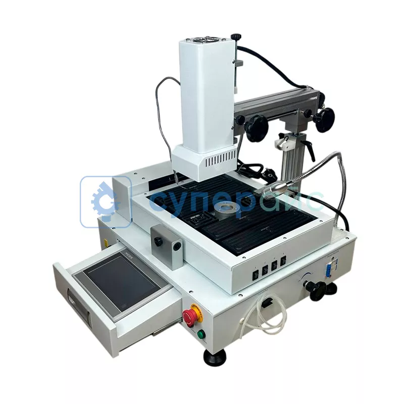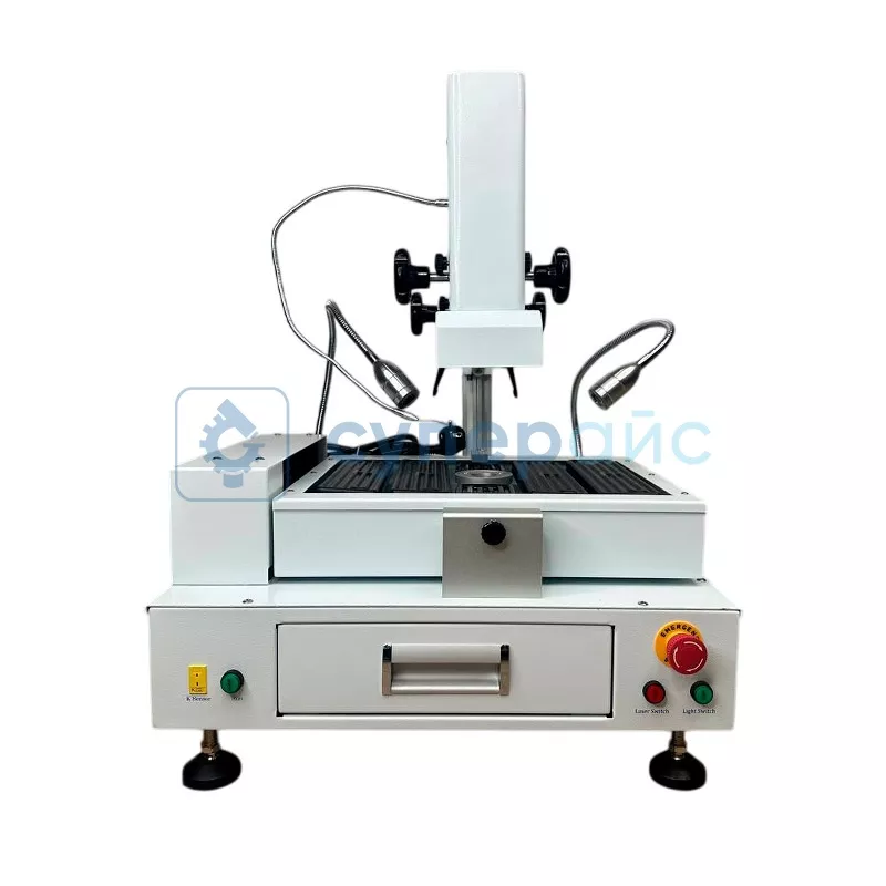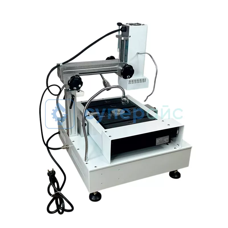 Для позиционирования применяется лазерный указатель. Предусмотрено подключение к компьютеру через интерфейс USB. Эта ИК-станция для пайки BGA оборудована также дополнительными держателями для платы и вакуумным захватчиком.