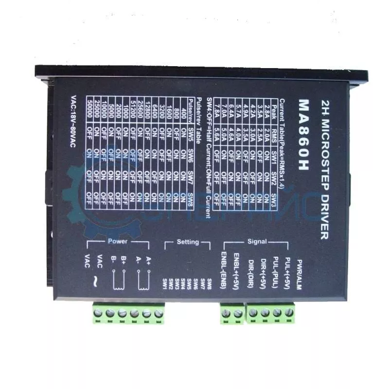 SUMTOR MA860H — драйвер для высокоточного управления работой шаговых двигателей 17-34 типоразмера NEMA. Представляет собой компактное электромеханическое устройство с двумя выходными фазами, которое оснащено сигнальным процессором. В него интегрированы современные управляющие алгоритмы, технология автоматического тестирования и самостоятельной настройки параметров, что гарантирует стабильную, плавную и эффективную работу разных типов двигателей. Использование драйвера SUMTOR MA860H позволяет подавить резонанс, подключить дополнительные устройства, защитить оборудование от перенапряжения.