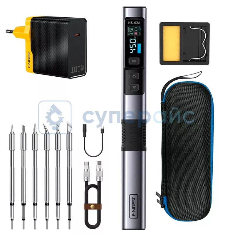 паяльник FNIRSI HS-02A F – 1 шт паяльное жало – 6 шт кабель USB Type-C – 1 шт мини-подставка – 1 шт переносная сумка – 1 шт кабель для зарядки C2C PD – 1 шт быстрое зарядное устройство – 1 шт |