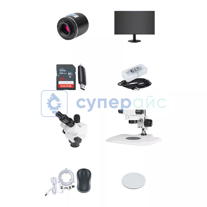 микроскоп AOSVI T3-HD208C – 1 шт окуляры WF10 X / 20 мм – 2 шт тринокулярная насадка – 1 шт HD-экран 21,5 дюйма – 1 шт цифровая камера – 1 шт карта памяти SD – 1 шт кард-ридер – 1 шт кабель HDMI – 1 шт измерительная линейка – 1 шт кронштейн (тонкий, веерный) – 1 шт компьютерная мышь – 1 шт кольцевой светодиодный осветитель – 1 шт cтолик для образцов (двухсторонний черный/белый) – 1 шт |
