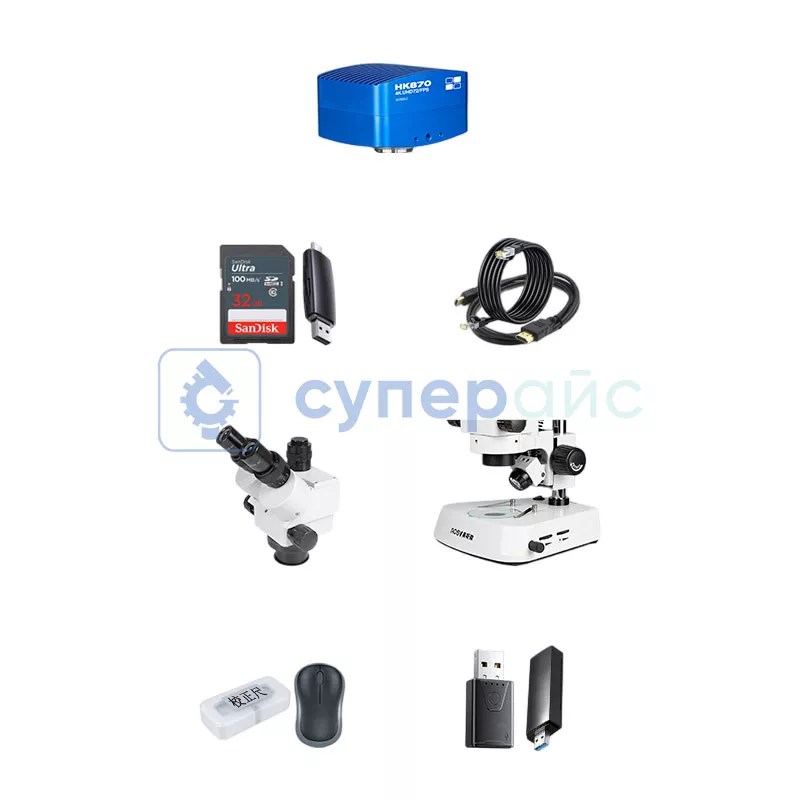 микроскоп AOSVI T6-HK870 – 1 шт окуляры WF10 X / 20 мм – 2 шт тринокулярная насадка – 1 шт 4K научная исследовательская камера – 1 шт карта памяти SD – 1 шт кард-ридер – 1 шт кабель HDMI – 1 шт кабель USB – 1 шт измерительная линейка – 1 шт стойка с проходящим освещением темного поля – 1 шт модуль Wi-Fi – 1 шт компьютерная мышь – 1 шт голосовой передатчик – 1 шт стеклянная пластина – 1 шт |
