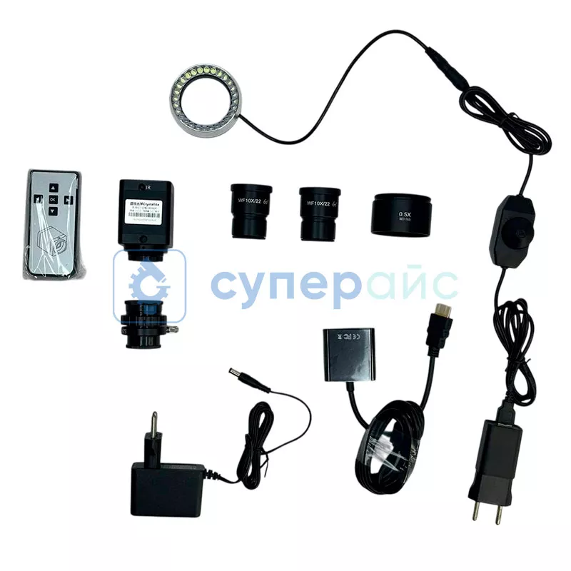 микроскоп Crystallite ST-7045 – 1 шт тринокулярная визуальная насадка – 1 шт поворотный объектив – 1 шт штатив – 1 шт окуляр WF10x – 2 шт резиновый наглазник – 2 шт защитное стекло объектива – 1 шт кольцевой источник света – 1 шт камера – 1 шт пульт дистанционного управления – 1 шт адаптер 1/3 для установки цифровой камеры – 1 шт плоское основание – 1 шт переходник VGA-HDMI – 1 шт инструкция по эксплуатации – 1 шт |