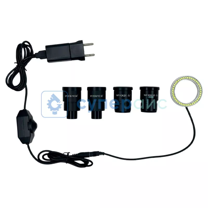 бинокулярная насадка – 1 шт поворотный объектив – 1 шт штатив – 1 ш окуляр WF10x – 2 шт окуляр WF20x – 2 шт предметный столик – 1 шт двусторонняя черно-белая пластина – 1 шт резиновый наглазник – 2 шт защитное стекло – 1 шт салфетка – 1 шт кольцевой светодиодный осветитель – 1 шт инструкция по эксплуатации – 1 шт |