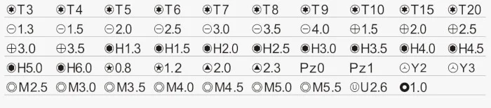 отвертка универсальная (110 мм) – 1 шт антистатический пинцет (115 мм) – 1 шт удлиняющая насадка с вращением (130 мм) – 1 шт удлиняющая насадка регулируемая (120 мм) – 1 шт шлиц Torx (T3, T4, T5, T6, T7, T8, T9, T10, T15, T20) – 10 шт шлиц Hex (H1.3, H1.5, H2.0, H2.5, H3.0, H3.5, H4.0, H4.5, H5.0, H6.0) – 10 шт шлиц PH (1.5, 2.0, 2.5, 3.0, 3.5) – 5 шт шлиц SL (1.3, 1.5, 2.0, 2.5, 3.0, 3.5, 4.0 ) – 7 шт шлиц Tri-Wing (Y2.0, Y3.0) – 2 шт шлиц U (2.6) – 1 шт шлиц Pozi (Pz0, Pz1) – 2 шт шлиц треугольный (2.0, 2.3) – 2 шт шлиц Pentalobe (0.8, 1.2) – 2 шт шлиц O-shape (R 1.0) – 1 шт шлиц Socket (M2.5, M3.0, M3.5, M4.0, M4.5, M5.0, M5.5) – 7 шт |