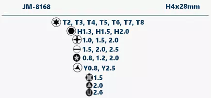 | отвертка универсальная – 1 шт шлиц Torx (T2, T3, T4, T5, T6, T7, T8) – 7 шт шлиц Hex (H1.3, H1.5, H2.0) – 3 шт шлиц Philips (1.0, 1.5, 2.0) – 3 шт шлиц Slotted (1.5, 2.0, 2.5) – 3 шт шлиц Pentalobe (0.8, 1.2, 2.0) – 3 шт шлиц Tri-Wing (Y0.8, Y2.5) – 2 шт шлиц Mainboard Philips (1.5) – 1 шт шлиц Triangle (2.0) – 1 шт шлиц U-Shaped (2.6) – 1 шт | |