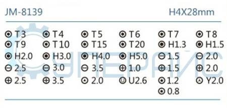CR-V биты (4 мм х 28 мм) – 31 шт удлинитель (H4 x 60 мм) – 1 шт присоска – 1 шт скрепка для лотка SIM карт – 1 шт пластиковый медиатр – 1 шт прорезиненная не скользящая ручка – 1 шт изогнутый остроконечный антистатический пинцет – 1 шт скальпель – 1 шт металлическая лопатка для разборки устройства – 1 шт канцелярский нож – 1 шт внутренние шестигранники 5 мм под крестобразную отвертку – 2 шт ракель (лопатка) с роликом для разборки устройства – 1 шт отвертка крестообразная 1,5 мм – 1 шт отвертка Pentalobe (пятиконечная звезда) 0,8 мм– 1 шт |