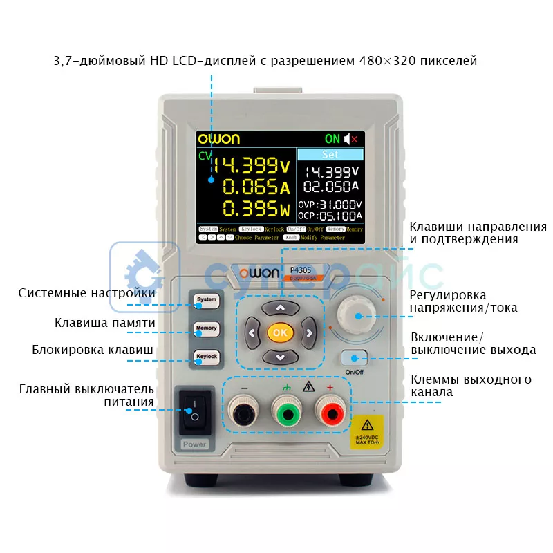 Его линейная архитектура обеспечивает стабильность даже при работе с динамическими нагрузками, например, при тестировании светодиодных драйверов или моторов постоянного тока. Возможность точной настройки тока ограничивает риск повреждения компонентов, а режим стабилизации напряжения поддерживает заданный уровень независимо от колебаний сети. Комплектация включает кабель RS-232 для подключения к ПК и документацию. OWON P4305 — это выбор для тех, кто ценит точность, долговечность и безопасность в профессиональном оборудовании.