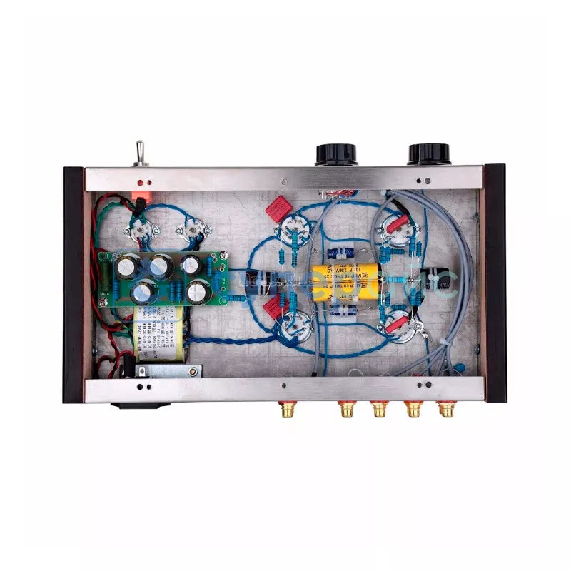 - Ламповая схема: 2×12AX7 (усиление), 2×12AU7 (буфер), 2×6Z4 (выпрямитель) — классическая топология для прозрачного звука с легким аналоговым колоритом.